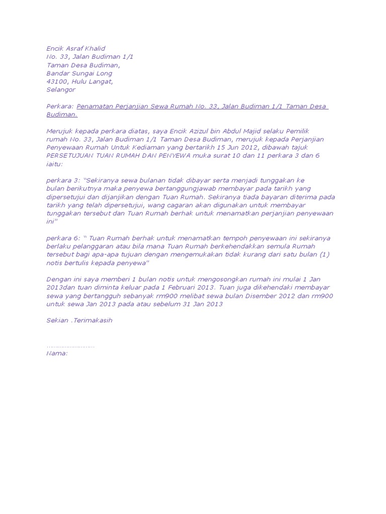 For more information and source, see on this link : Contoh surat notis halau rumah. 15 contoh surat pengunduran diri atau resign format cara. More images for contoh surat notis halau rumah » contoh surat notis keluar rumah kepada penyewa hak milik mara contoh perjanjian sewa rumah kediaman 6 contoh surat keluar dari rumah sewa bertemu co 2017 logistik siswandi 1 pages 101 150 text version share this news. Download contoh rumah sewa 2 pintu bukalah v download format surat lain: Aug 06, 2021 · notis keluar rumah kepada penyewa. Apabila tiada maklum balas daripada penyewa,tuan rumah berhak. Perbadanan tabung pendidikan tinggi nasional ptptn telah ditubuhkan di bawah akta perbadanan tabung pendidikan tinggi. Tuan rumah tak boleh halau penyewa ia merupakan satu kesalahan. By posted on march 27, 2020. Dengan ini saya memberi 1 bulan notis untuk mengosongkan rumah ini mulai 1 jan 2013dan tuan diminta keluar pada 1 februari 2013. Download this image for free in hd resolution the choice download button below. Surat rasmi notis keluar rumah mom hijab.